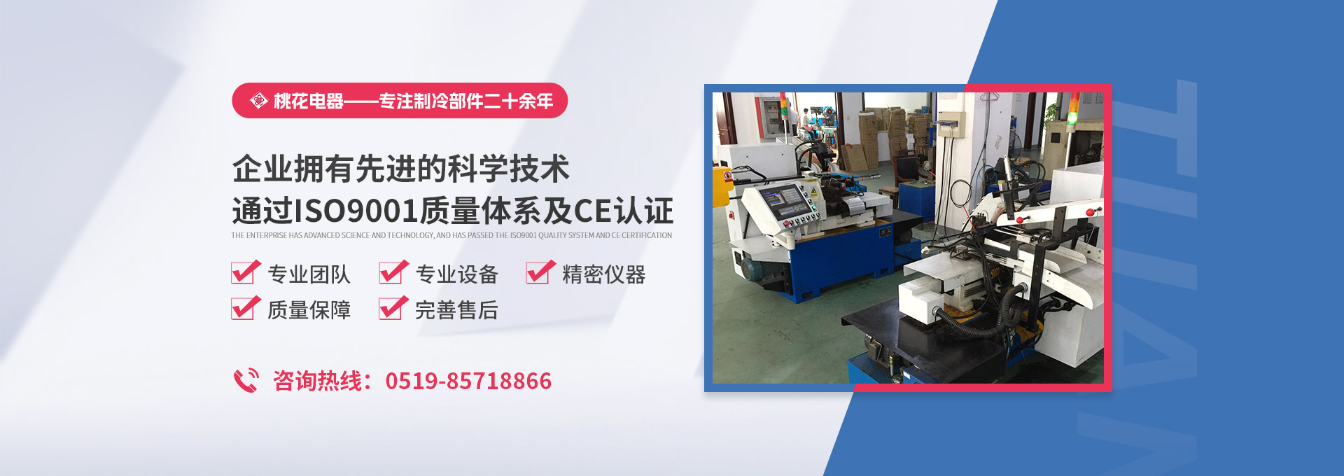 常州桃花電器有限公司地處中國(guó)長(zhǎng)江“金三角”之稱的上海至南京高速公路、城際高鐵、常州高新經(jīng)濟(jì)技術(shù)開(kāi)發(fā)區(qū)路段,交通便利、技術(shù)力量十分雄厚。它是集研究、開(kāi)發(fā)設(shè)計(jì)、制造和經(jīng)營(yíng)制冷核心部件的企業(yè),主要生產(chǎn)中央空調(diào)上使用的制冷部件。產(chǎn)品有膜片式單向閥、鋼球式單向閥、四氟式單向閥、過(guò)濾器、消音器等系列。年生產(chǎn)制冷核心部件200萬(wàn)只,其性能達(dá)到國(guó)際同類產(chǎn)品水平。  企業(yè)擁有先進(jìn)的科學(xué)技術(shù)、國(guó)際先進(jìn)的生產(chǎn)加工設(shè)備和精密的檢測(cè)儀器,并已通過(guò)ISO9001質(zhì)量體系及CE認(rèn)證,公司歷史悠久,2000年起,經(jīng)過(guò)長(zhǎng)期積累、沉淀,經(jīng)驗(yàn)豐富,從而保證了產(chǎn)品的高質(zhì)量、高性能、高耐用性。企業(yè)產(chǎn)品在國(guó)內(nèi)外市場(chǎng)具有較高的知名度,深受眾多中外品牌制冷客商的好評(píng)。主要客戶有約克、麥克維爾、美的、開(kāi)利、特靈、頓漢布什、清華同方、天加等.并出口北美、歐洲、東南亞等地區(qū)。  高品質(zhì)產(chǎn)品是企業(yè)的保證,周到服務(wù)是合作友誼的承諾,企業(yè)本著“求